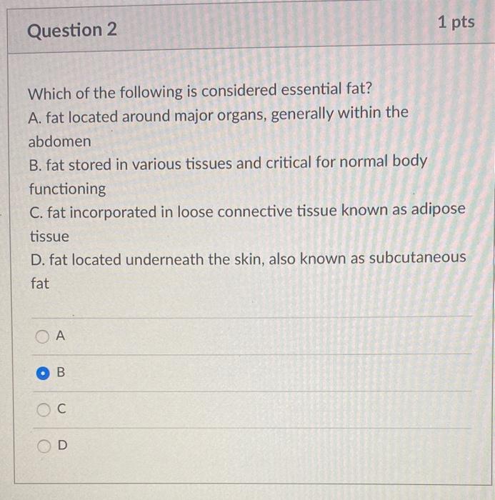 Solved: Which Of The Following Is Considered Essential Fat... | Chegg.comBody fat types: Benefits, Hazards and MoreDespite the extensive use of the word "grase" to describe all body fat, there are actually several different types of fat in your body. Some types of fat may have a negative effect on your health and contribute to the disease. Others are beneficial and necessary for your health. The cells are white, brown and beige cells. They can be stored as essential, subcutaneous or visceral fat. Each type of fat serves a different role. Some promote metabolism and healthy hormone levels, while others contribute to life-threatening diseases, including: Read more about different types of body fat. White fat is the type of fat that most people think immediately. It is composed of large white cells that are stored under the skin or around organs in the belly, arms, buttocks and thighs. These fat cells are the form of the body to store energy for later use. This type of fat also plays a great role in the function of hormones such as:While a white fat is necessary for good health, too much white fat is very harmful. Healthy body fat percentages vary depending on your fitness level or physical activity. According to , men who are not athletes should have a total percentage of body fat in the range of 14 to 24 percent, while women who are not athletes should be in the range of 21 to 31 percent. A percentage of body fat above the recommended may put at risk the following health problems: it is a type of fat that is mainly found in babies, although adults still retain a very small amount of brown fat, typically in the neck and shoulders. This kind of fat to keep you warm. Researchers are interested in finding ways to stimulate brown fat activity to help prevent obesity. Beige fat (or brita) is a relatively new area of research. These fat cells work somewhere between brown and white fat cells. Similar to brown fat, beige cells can help burn fat instead of storing it. It is believed to be released when stressed, cold or when exercise is done can help convert white fat into beige fat. This is an exciting area of research to help prevent obesity and maximize healthy body fat levels. Essential fat is exactly that — essential for your life and a healthy body. This fat is found in its: Essential fat plays an important role in hormonal regulation, including hormones that control fertility, vitamin absorption and temperature regulation. According to , women need at least 10 to 13 percent of their body composition to come from essential fat to good health, while men require at least 2 to 5 percent. refers to fat stored under the skin. It is a combination of brown, beige and white fat cells. Most of our body fat is subcutaneous. It is the fat that can be tightened or pinched in the arms, belly, thighs and buttocks. The aptitude professionals use the calipers to measure subcutaneous fat as a way of estimating the total percentage of body fat. A certain amount of subcutaneous fat is normal and healthy, but too much can lead to unbalanced hormone levels and sensitivity. , also known as "rule oil", is the white fat that is stored in your abdomen and around all its principal organs, such as the liver, kidneys, pancreas, intestines and heart. High levels of visceral fat can increase the risk of diabetes, heart disease, stroke, artery disease, and some cancers. Body composition is very important. Your body will work better with a suitable overall fat percentage. Having a percentage of healthy body fat provides many benefits, such as: Having too much white fat, especially visceral fat, can be harmful to your health. Visceral fat can increase the risk of the following health conditions: Body composition can be measured using. A common method to estimate the percentage of body fat is skin measurements. A trained technician can use calipers, an instrument similar to that of the hand, to pinch and measure skin folds in the arms, waist and thighs to estimate the total percentage of body fat. This method measures mainly subcutaneous fat. Another method is to use a device called Bod Pod. During an evaluation of body composition, the design uses body weight ratios and volume to determine the total percentage of fat. This method theoretically measures all types of fat present in your body. Bioelectrical impedance analysis is another method to determine the percentage of body fat. It is often used in athletic sports facilities. This test involves standing on a device that uses electric current to measure the amount of lean mass versus fat in your body. and circumference tests of the waist can also be useful. Although they do not provide a specific percentage of body fat, they do provide an estimate based on their height and weight. The BMI is calculated as a weight-to-height ratio, while the waist circumference is a measurement of the smallest part of the waist. According to , a BMI exceeding 25 is considered overweight, while a BMI exceeding 30 is considered obese. A waist circumference of more than 35 inches in women and 40 inches in men is considered to be a higher risk of disease, as increased waist circumference may indicate the presence of visceral fat. A common assumption is that a high fat diet is what makes a person too much body fat. This is only partially true. While fat is higher in calories than carbohydrates or proteins, people need a certain amount of dietary fat for good health. refined and processed foods that are high in carbohydrates and low in fiber can also cause weight gain. People with high diets in refined sugars and processed foods are often more prone to visceral fat, which is more dangerous as a predictor of disease than subcutaneous fat. The calories consumed that are not required by the body will be stored as fat reserves. In terms of gaining or losing weight, the total number of calories you take against the calories you burn every day is what matters, instead of whether those calories are fat